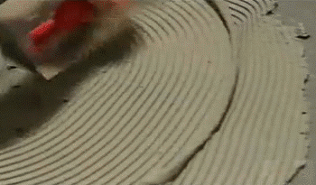 第3步:將磚材背面直接揉壓于基面上。磚材背面溝較深或較重的石材,除了在基面上摸膠漿外,還應(yīng)在磚材背面摸上膠漿。瓷磚膠不同于水泥貼磚,不用浸濕瓷磚,直接黏貼揉壓均勻即可。